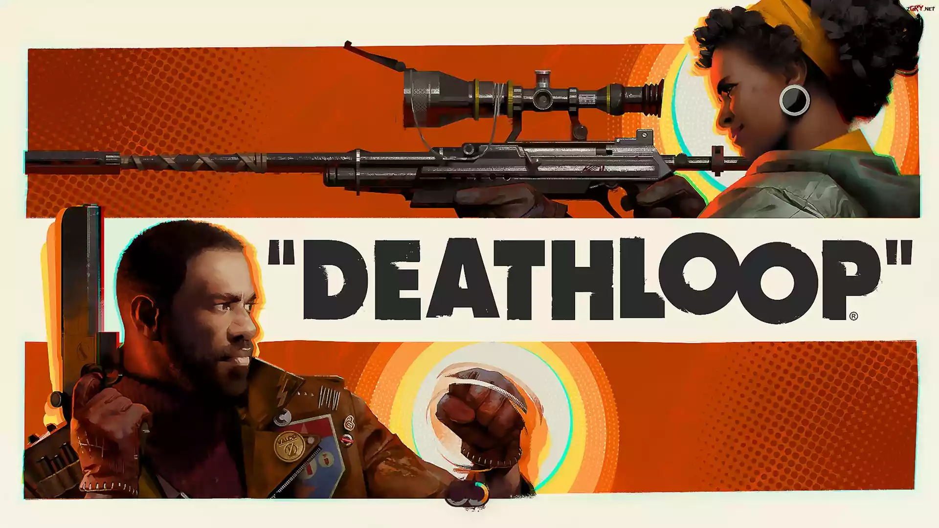 Screen, Deathloop, Postacie, Colt Vahna, Julianna Blake, Pistolet, Karabin, Snajperka, Plakat