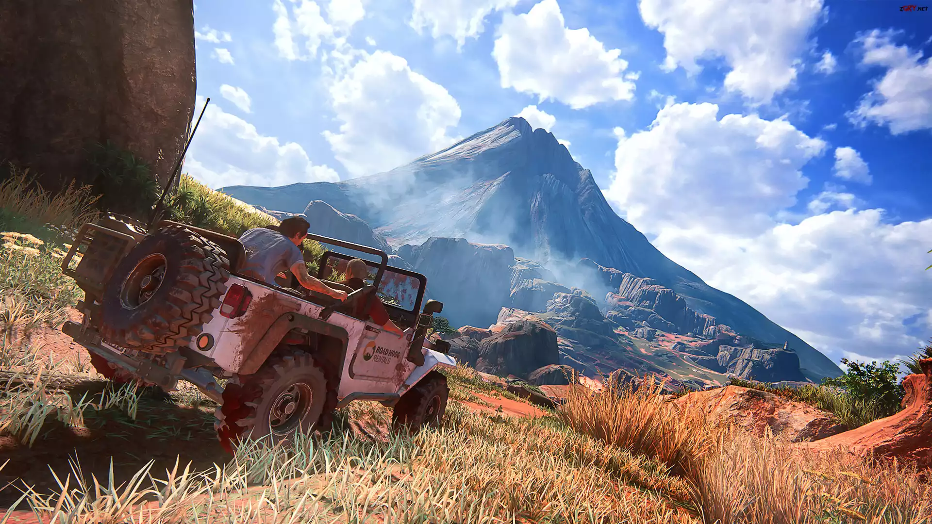 Gry, PC, XBOX, PS4, Uncharted 4 A Thiefs End, Samochód, Terenowy, Różowy, Góry, Wulkan