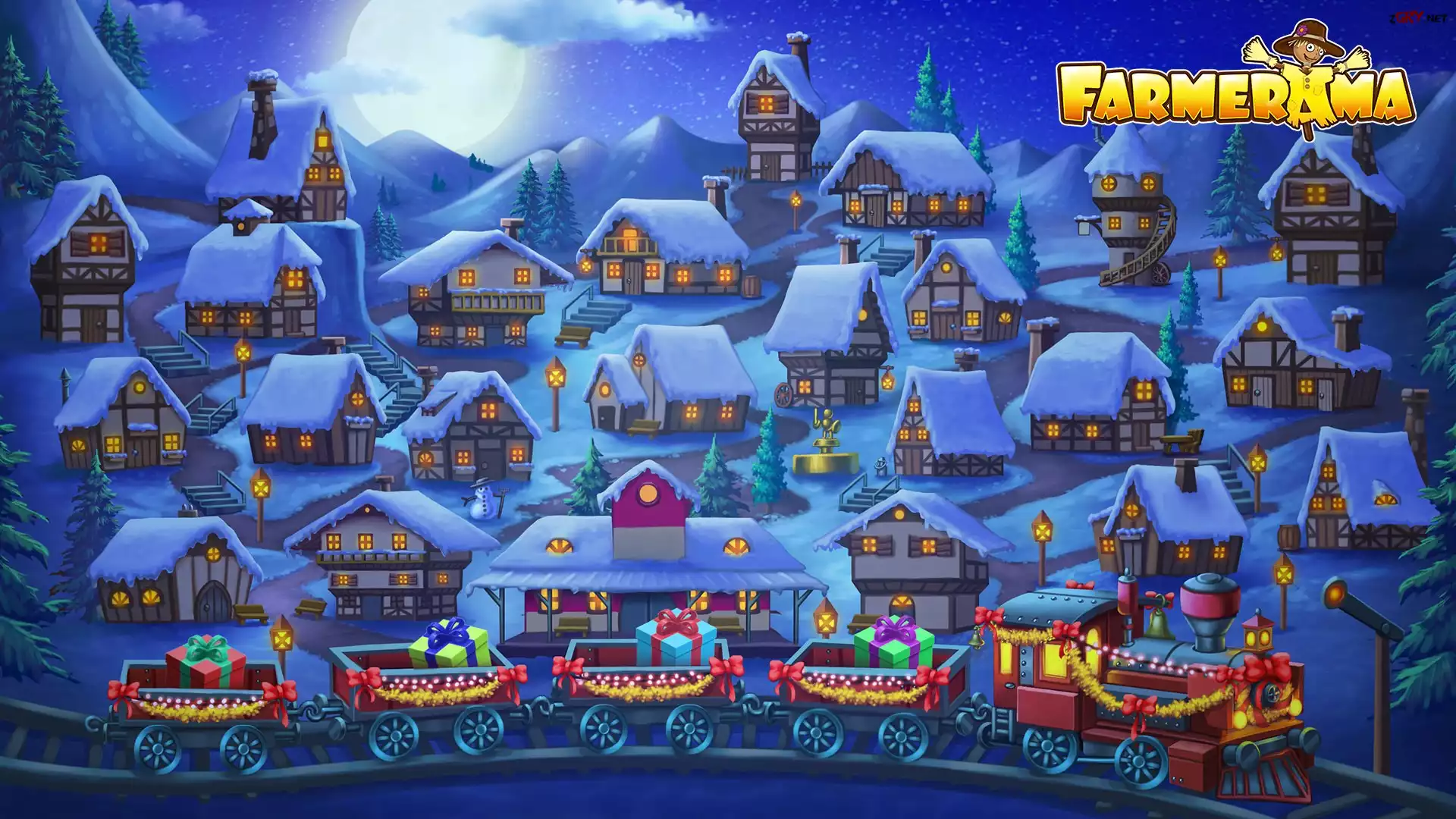 Screen, Gra, Farmerama, Pociąg, Noc, Domy, Księżyc, Góry, Drzewa, Światła