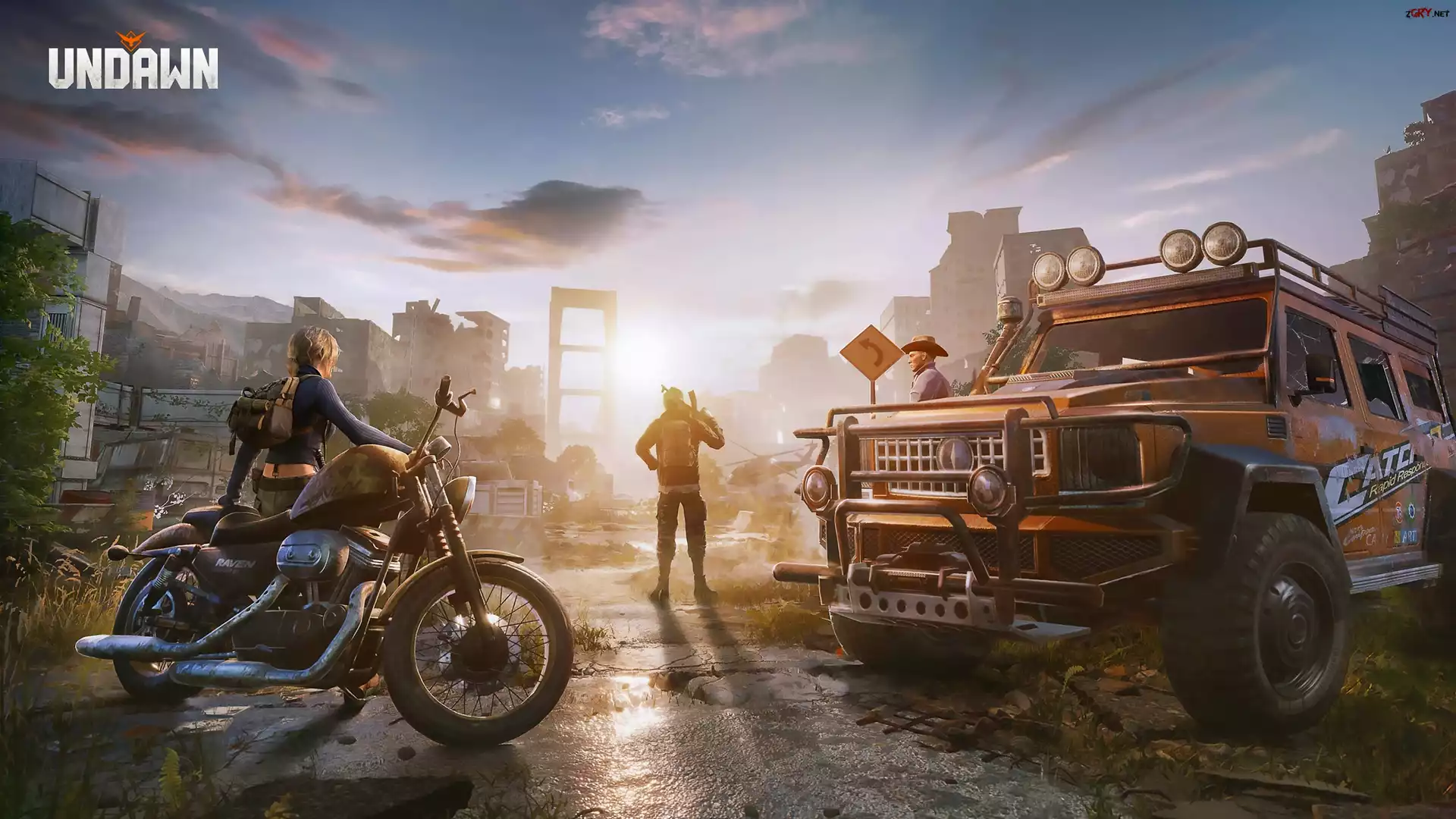 Screen, Gra, Undawn, Postacie, Motocykl, Samochód, Terenowy, Miasto, Świt, Plakat