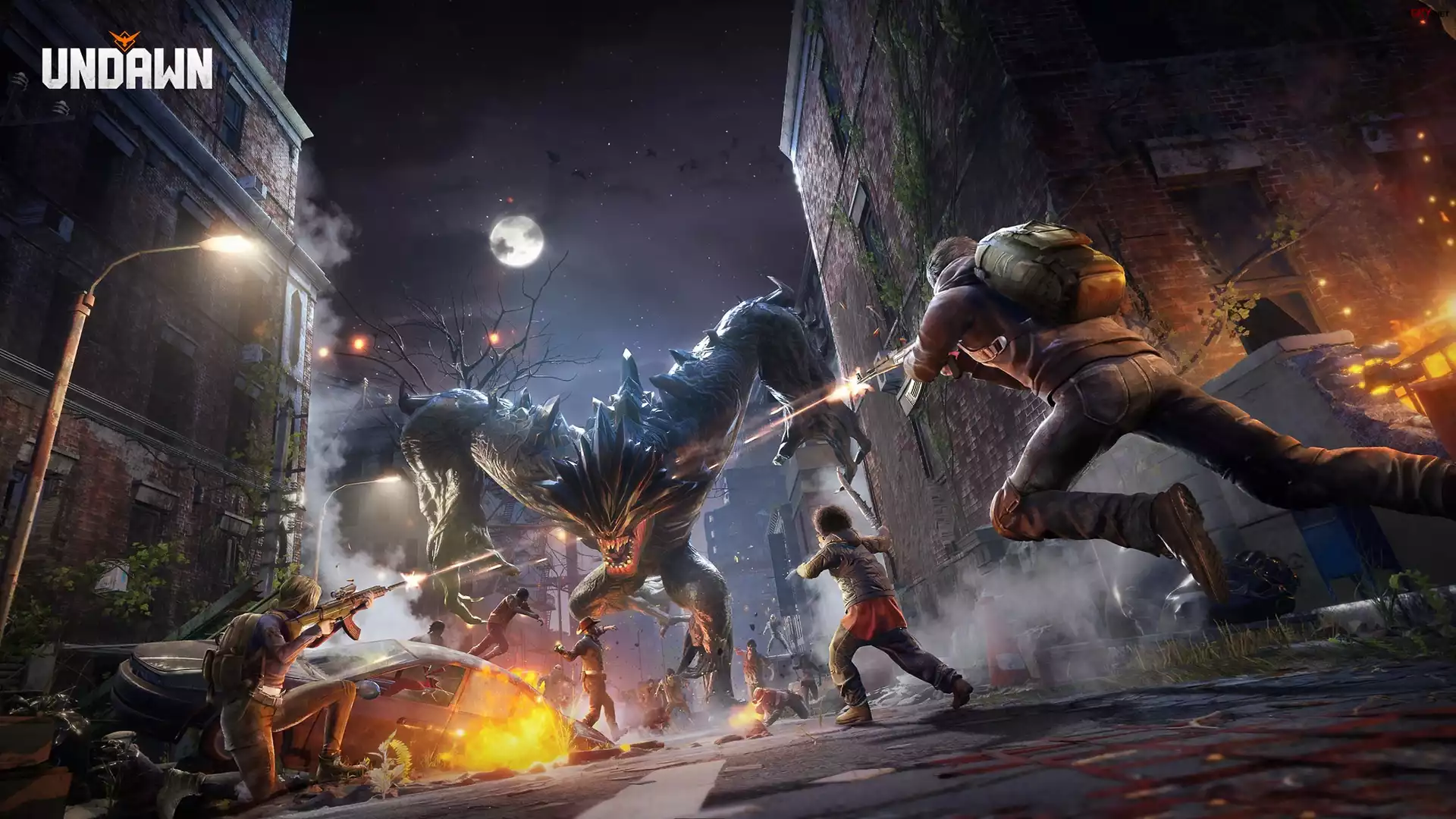 Screen, Gra, Undawn, Ludzie, Potwór, Miasto, Ulica, Noc, Księżyc, Walka, Plakat