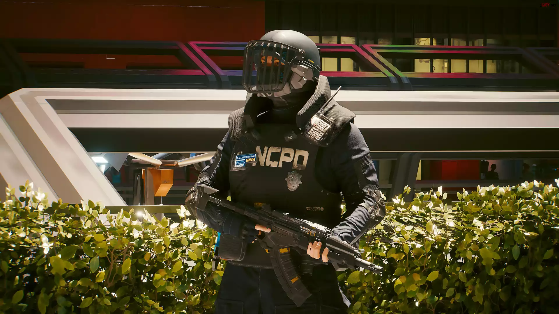 Screen, Gra, Cyberpunk 2077, Postać, Policjant, Broń, Hełm, Kamizelka
