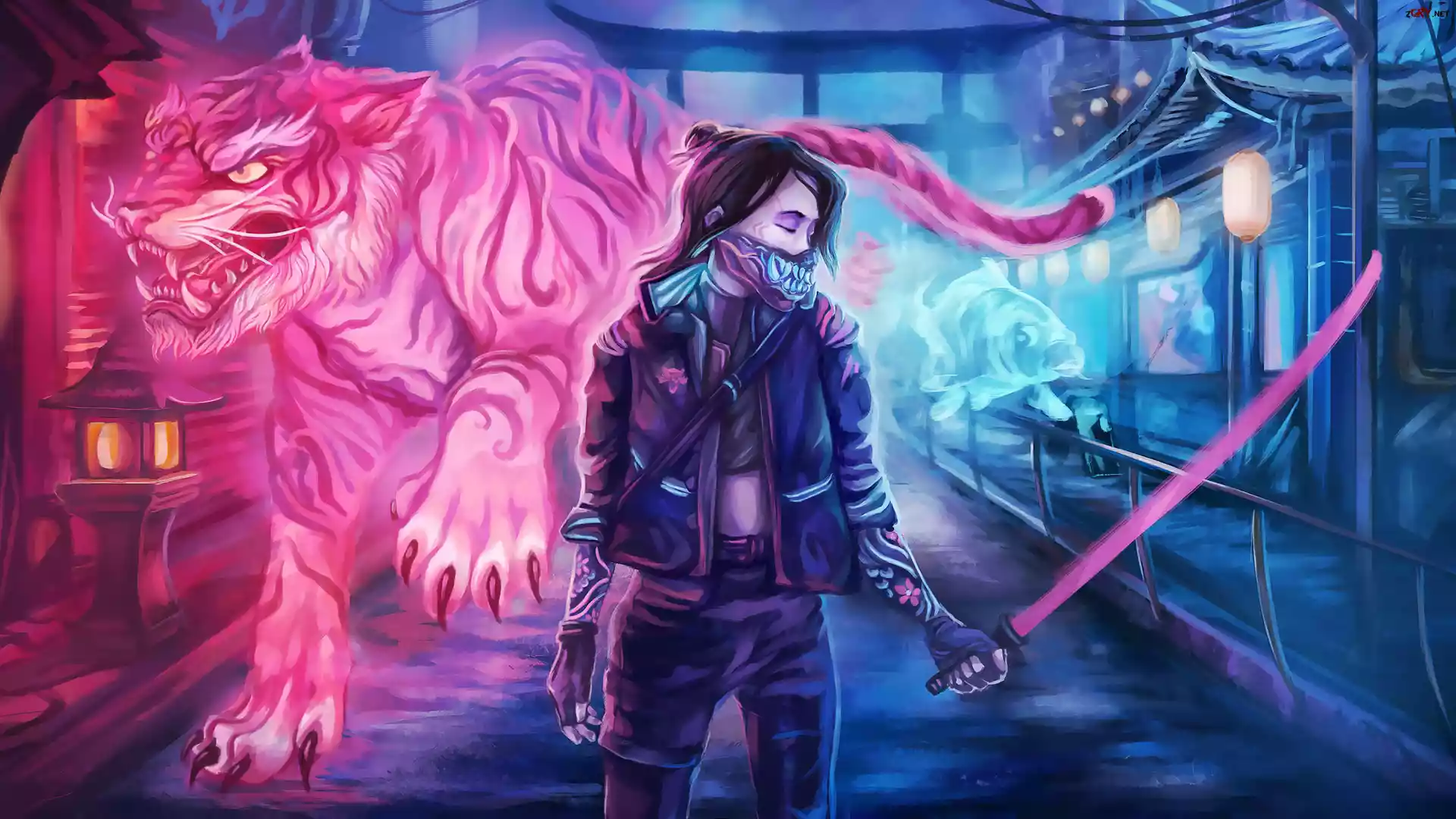 Screen, Gra, Cyberpunk 2077, Kobieta, Miecz, Tygrys, Ryba