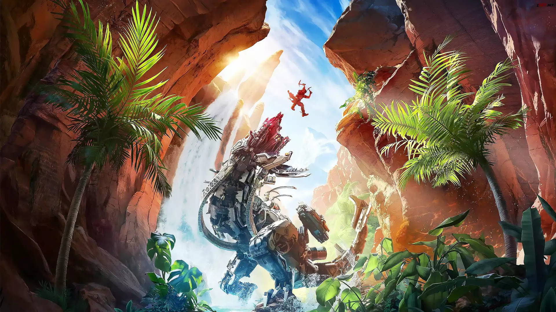 Gra, Horizon Call of the Mountain, Palmy, Rośliny, Góry, Wodospad, Cyberpotwór, Postać, Skok