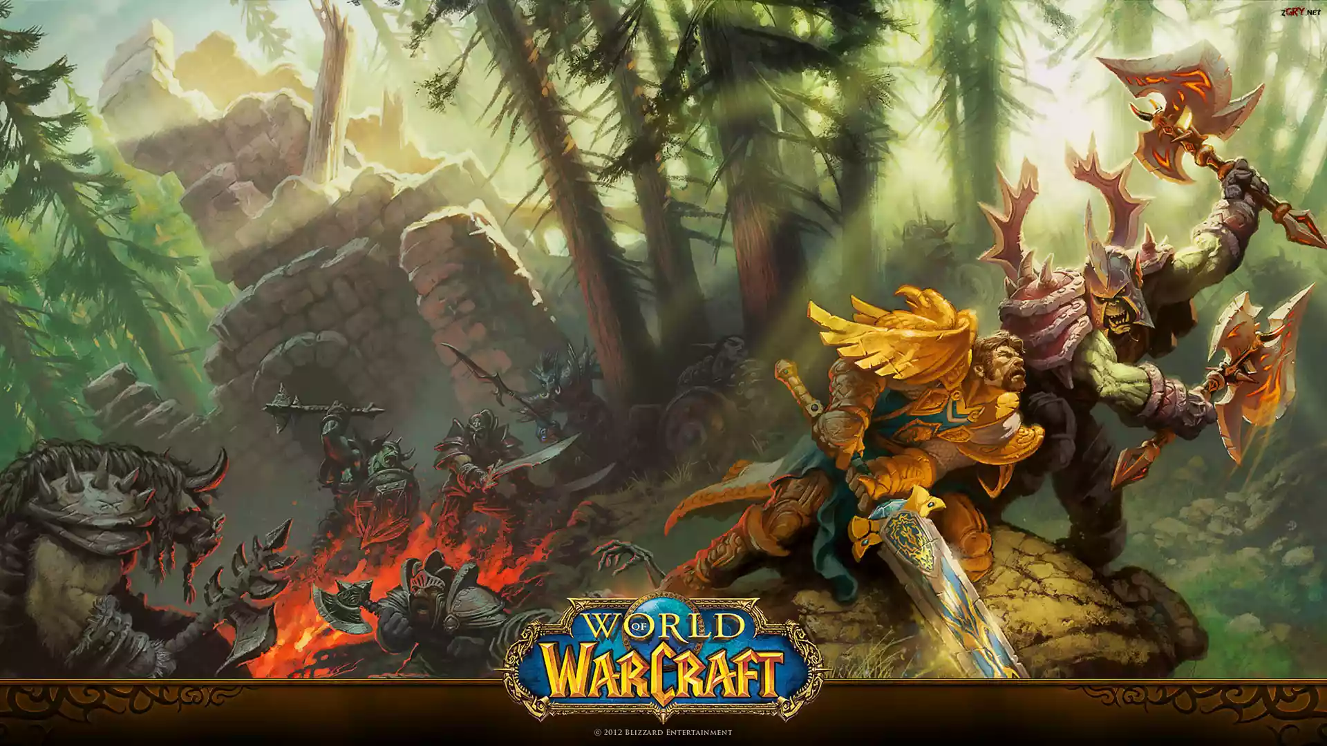 Screen, Gra, World of Warcraft, Postacie, Rycerze, Orki, Las, Ruiny, Ogień, Walka, Plakat