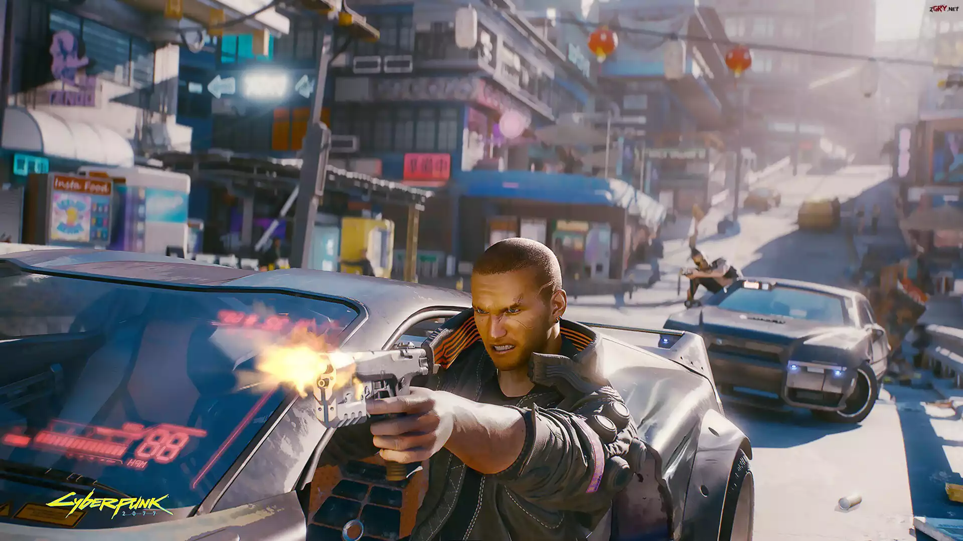 Screen, Gra, Cyberpunk 2077, Mężczyzna, Walka, Samochody, Ulica, Plakat