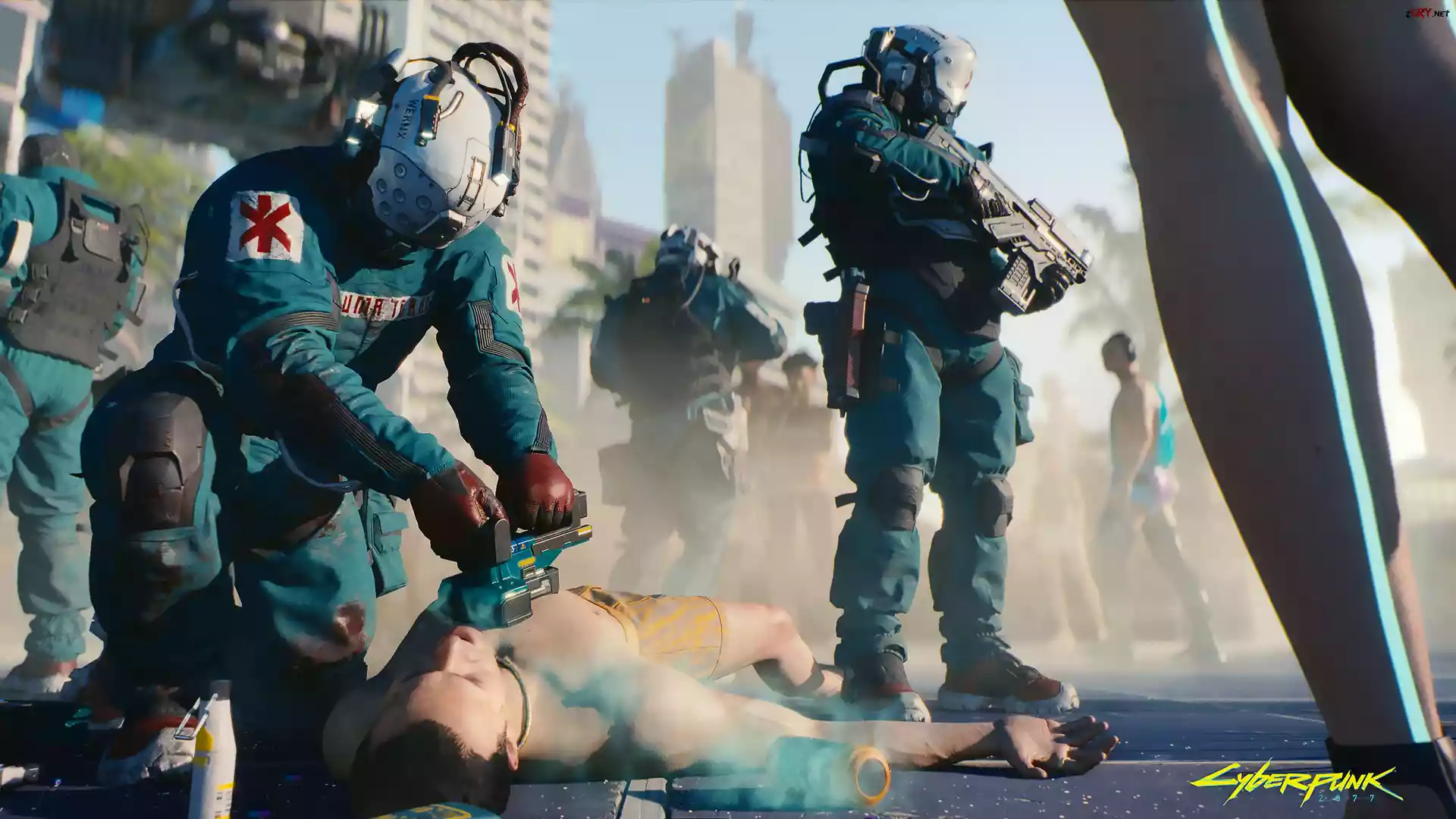 Screen, Cyberpunk 2077, Ratownik, Reanimacja, Ochroniarze, Ulica, Plakat
