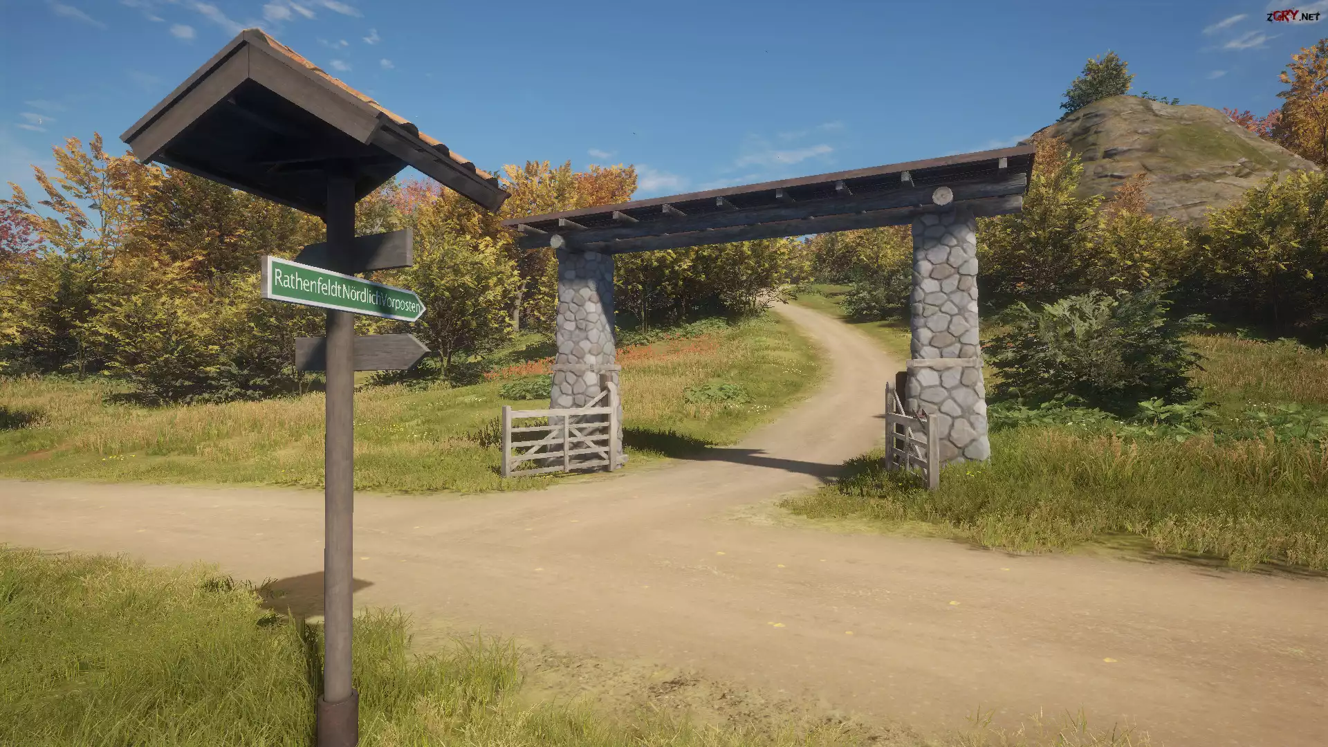 Gra, TheHunter Call of the Wild, Rathenfeldt, Hirschdorf, Droga, Rozwidlenie, Znak, Brama