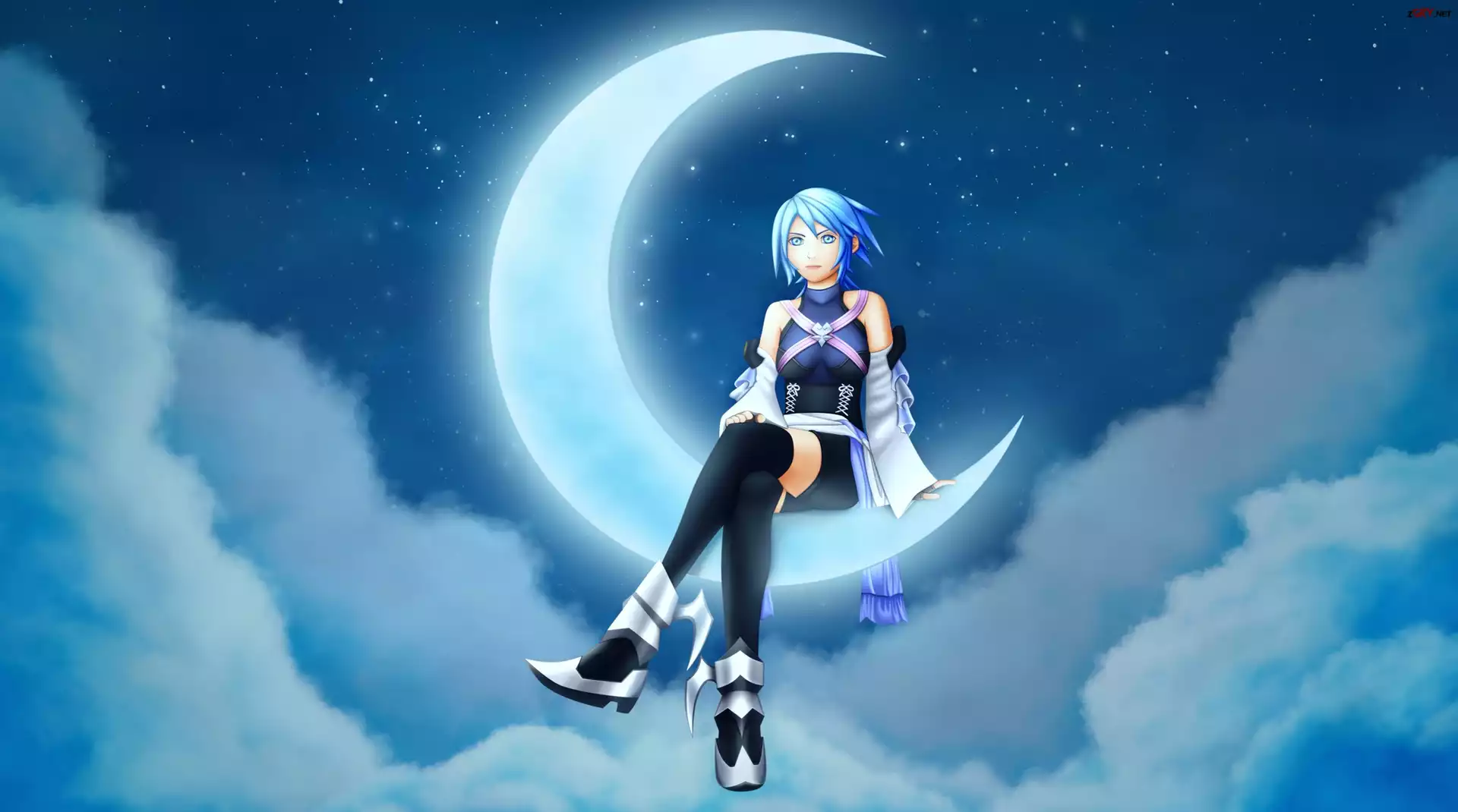 Gra, Kingdom Hearts Birth by Sleep, Dziewczyna, Aqua, Księżyc, Niebo, Chmury, Noc