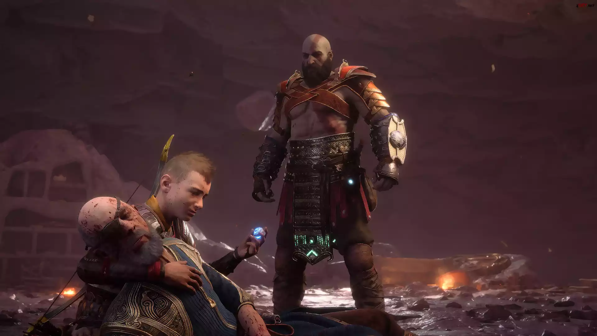Screen, Gra, God of War Ragnarok, Postacie, Kratos, Atreus, Loki, Śmierć, Łuk, Klejnot, Pancerz